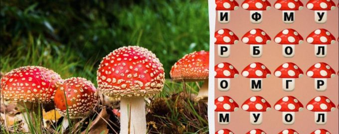 దిగువన ఉన్న కోల్లెజ్లో, యాదృచ్ఛిక క్రమంలో చిన్న ఫ్లై అగారిక్ పుట్టగొడుగులపై డజన్ల కొద్దీ అక్షరాలు అమర్చబడి ఉండటం మీరు చూస్తారు. ఈ గందరగోళంలో ఎక్కడో మనం “ఫ్లై అగారిక్” అనే పదాన్ని దాచాము.