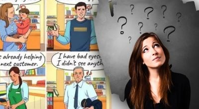 మీరు చేయాల్సిందల్లా క్రింద ఉన్న చిత్రాన్ని చూసి, స్టోర్లోని వ్యక్తి ఎవరి వాలెట్ను దొంగిలించాడో నిర్ణయించండి. చిత్రీకరించబడిన వ్యక్తులలో ముగ్గురు నిజం చెబుతున్నారు, కానీ వారిలో ఒకరు అబద్ధం చెబుతున్నారు.